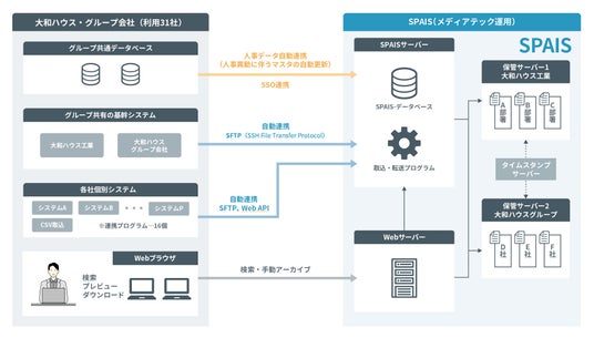 大和ハウス工業は、導入決定からわずか9ヶ月でSPAISを基盤とした電帳法対応を含むデジタル帳票基盤を構築し、2023年10月に本社およびグループ会社を含む31社で運用を開始しました。このデジタル帳票基盤には、グループ共通データベース、共有の基幹システム、各社の個別システムが自動連携され、経理データや契約書など約30種類の帳票データの自動連携と統合的な運用が実現しています。