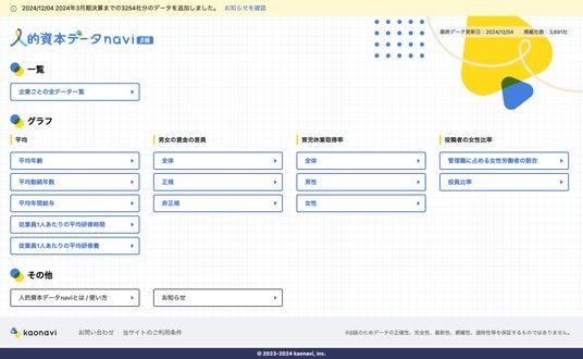 株式会社カオナビ(本社:東京渋谷区、代表取締役社長 Co-CEO:佐藤 寛之、以下:当社)が提供する「人的資本データnavi β版」は、2023年10月期~2024年3月期決算の上場企業の有価証券報告書データを、2024年12月4日(水)に追加します。