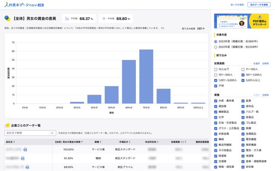 本サービスは、上場企業の人的資本に関連する開示情報を収集し、一覧化しています。各社が開示している女性管理職比率や男性の育児休業取得率、男女間賃金格差などの平均値を算出するほか、結果を棒グラフで表示します。その上で、従業員数別・業種別・エリア別などをかけ合わせ、絞り込みや指定項目の並び替えができるため、同業種など自社に近い条件の企業の傾向を確認することが可能です。