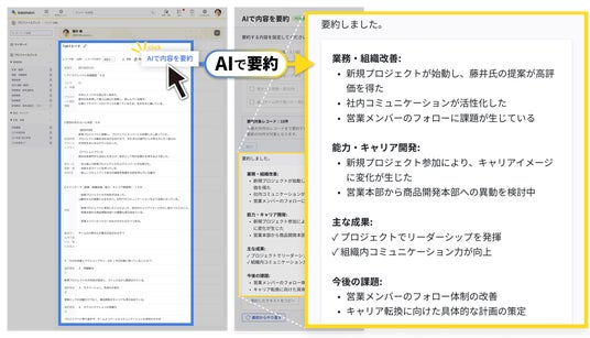 こうした課題に対応するため、個人のあらゆる情報を集約できる「プロファイルブック」に生成AIの要約機能を拡張しました。柔軟なカスタマイズ性を持つ「プロファイルブック」への適用により、社員を理解する上で必要な情報を人事やマネージャーが効率的に把握できるようになり、また個人が自身の解像度を高める手段として活用することも期待できます。