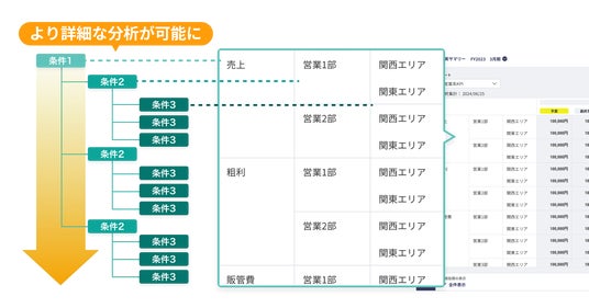 本機能により、売上数量や商談化率、ESG数値など、非財務指標のKPI管理が可能になります。また、損益計算書(P/L)データおよび非財務データに部署やカテゴリー、地域などの複数の階層で、集計や差分が発生している箇所の要因分析を、多角的に行えるようになります。