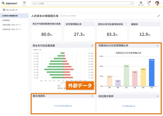 こうした状況の下、グラフや数値を用いて直感的に現状を把握できるダッシュボードの有用性が高まっています。当社はこの変化に応え、「カオナビ」の内部データに限定していたダッシュボード機能を進化させ、外部データのアップロードを可能にしました。これにより、業界全体のマクロ情報との比較、別システムのデータを用いた多角的な分析など、統合的な視点による分析を実現できます。