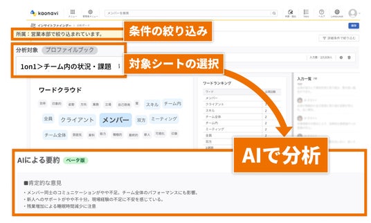 社員の声やデータベースの情報などを、分解・整理・見える化することで、要点の把握や傾向の分析を助ける機能です。分析したいシートを選択すると、単語の頻出度に応じて視覚的な強調やランキングが表示されるほか、感情別の要約もワンクリックで行えます。さらに、年齢や所属、雇用形態など、「カオナビ」に登録されている属性を絞り込んで分析することも可能です。膨大な情報を短時間で整理し、重要なインサイトを迅速に抽出します。