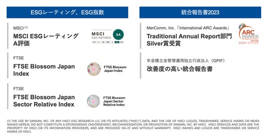 その結果、今年度の「MSCI ESGレーティング」において、当社として初めて「AA」評価を獲得(※2)、さらにESG投資の代表的指数である「FTSE Blossom Japan Index」に初めて選定される(※3)など、さまざまな外部評価を獲得しています。