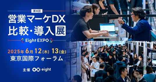 Sansan株式会社が提供する名刺アプリ「Eight」は、営業・マーケティング分野のDX推進をテーマにしたビジネス展示会「Eight EXPO 第4回 営業マーケDX 比較・導入展(以下、Eight EXPO)」を、2025年6月12日(木)・13日(金)の2日間、東京国際フォーラムにて開催します。