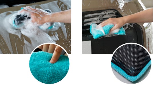 洗浄面には表裏異なる素材を採用し、使用シーンに応じて使い分けが可能。フリース面は手触りが良く、たっぷりとシャンプー液を保持するのでボディを優しく撫で洗いすることができます。メッシュ面を使用すれば、その編み込み部分で虫や鳥フンなどをしっかり洗浄することができます。