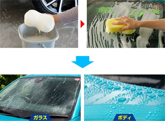 まるでシャンプー洗車のように洗浄するだけで、汚れ落としと同時にボディだけでなくガラスにも撥水コーティング被膜を形成する、新感覚の“洗える”コーティング剤。シャンプーとコーティング剤を別々に用意することなく、これ1本で洗車からコーティングまでが完了します。