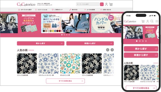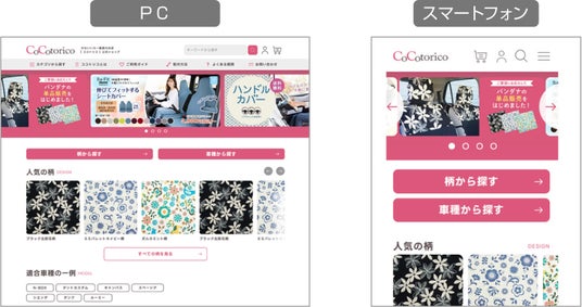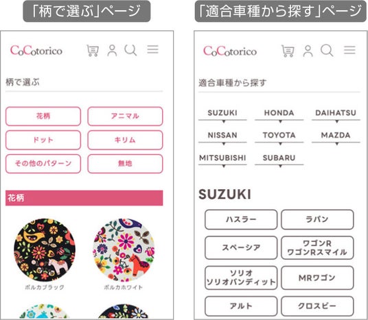 シートカバーやハンドルカバーなど、商品を探す際の入口として利用機会の多い「柄で選ぶ」「適合車種から探す」のページを刷新。
