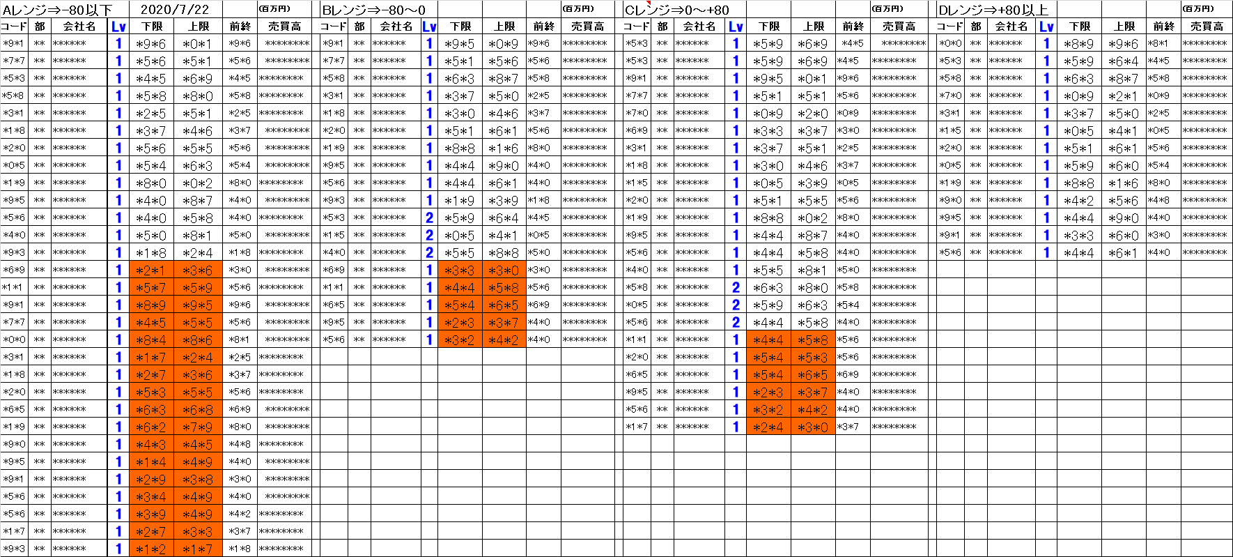 2020/7/22(水曜日) 今日のシステムトレードの仕掛候補一覧です。今日の日経の寄り付きはAレンジでした仕掛表の各レンジは日経平均の前日終値比で以下のよ... ...続きを読む