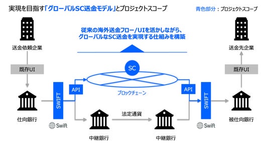 こうした観点から、SC利用者である事業会社と金融機関間の国際送金プロセスやユーザーインターフェイス(UI)を踏襲しつつ、国内外の金融機関間の送金プロセスとしてSCを活用した新たなネットワークを提供することで、より早期に、現実的な形でSCのメリットを社会に還元することが可能となります。