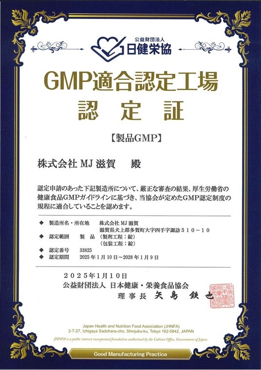 森下仁丹株式会社(本社:大阪市、代表取締役社長 森下雄司、以下「当社」)は、グループ会社で医薬品・健康食品製造業等を行う株式会社MJ滋賀(本社:滋賀県犬上郡多賀町、代表取締役社長:森下雄司、以下「MJ滋賀」)が、公益財団法人 日本健康・栄養食品協会が定める健康食品GMP(Good Manufacturing Practice)認証を2025年1月10日に取得したことをお知らせいたします。
