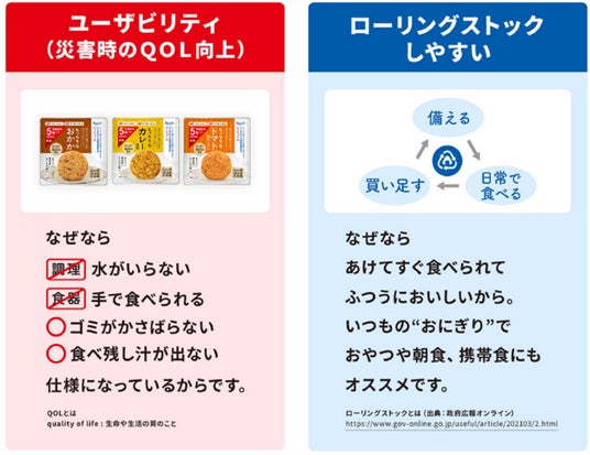 「あけてすぐ食べられて、ふつうにおいしい5年常温保存おにぎり」というコンセプトで、「もしも」の災害時だけでなく、「いつも」の日常でも定期的に食べることができる循環備蓄食品です。大人も子どもも慣れ親しんだおにぎりを食べることでほっと安心できる、心と命を守る食品です。防災意識が高まる中、備蓄食料の備えは重要ですが、一部の備蓄食料が食べられることなく、廃棄されているという社会課題も身近に起きています。そこで、「いつも」の日常でも、携帯食や朝食など定期的に食べることができ、定期的なローリングストックを意識することで、備蓄食品のフードロス削減、もったいない廃棄を減らすという、循環型の備蓄食普及を目指しています。製造年、保存期間をわかりやすく表記するデザインにもこだわりました。