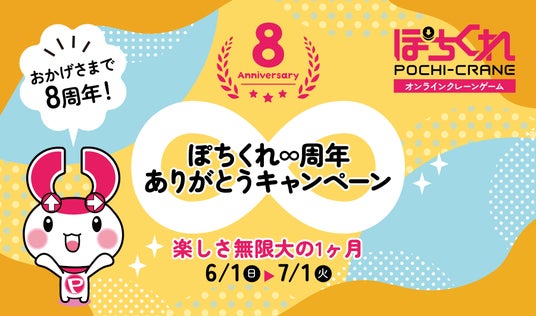 SDエンターテイメント株式会社(北海道札幌市、代表取締役社長 高橋 誠 東証スタンダード4650)が運営するオンラインクレーンゲーム「ぽちくれ」は、多くのお客様に支えられ、2025年7月で8周年を迎えます。これまでの感謝の気持ちを込めて、6月1日(日)~7月1日(火)までの期間中、「ぽちくれ∞周年ありがとうキャンペーン」を開催いたします。