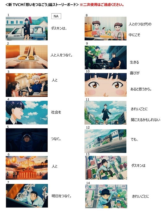 株式会社ダスキン(本社:大阪府吹田市、社長:大久保 裕行)は、2026年度採用と事業理解向上を目的としたブランドコミュニケーションの一環として、新TVCM「想いをつなごう」篇を2025年2月15日(土)より放映いたします。本TVCMには、漫画家の浅野いにおさんによる、当社の16事業を擬人化したオリジナルキャラクターが登場します。楽曲は、sumikaの新曲「Vermillion(ヴァーミリオン)」を採用いたしました。