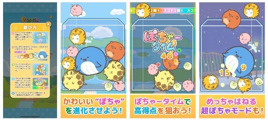 『Poppin ぽちゃーズ』は“ぽちゃ”化したかわいいキャラクター「ぽちゃーズ」たちを落下させる簡単操作のパズルゲームです。同じ“ぽちゃ”がぶつかると、次の大きさの“ぽちゃ”に進化し、ボックスから“ぽちゃ”があふれてしまうと、ゲームは終了となります。また、“ぽちゃ”の進化20回毎に、スコアが2倍になる「ぽちゃータイム」が発生し高得点が狙えます。さらに、スコア500以上を記録すると、“ぽちゃ”が跳ねまくる上級者向けの「超ぽちゃモード」が解放。“ぽちゃ”たちの予想が難しい動きになり、通常時より難易度が高くなります。単純なゲームですが、飽きのこないゲーム性で隙間時間にプレイできる作品です。