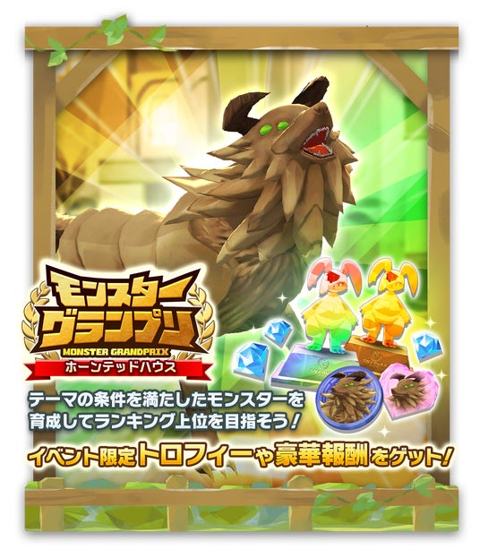 「モンスターグランプリ 『ホーンデッドハウス』」を開催します。前半、後半で3つずつ用意されたテーマに沿ってモンスターを育成完了し、「いいね(総合力を元にしたポイント)」でランキングを競います。月の前半、後半を合算した総合ランキングにより獲得できる専用トロフィーには総合ランキングの順位が保存され、いつでも確認することができます。イベントの詳細はゲーム内にてご確認ください。