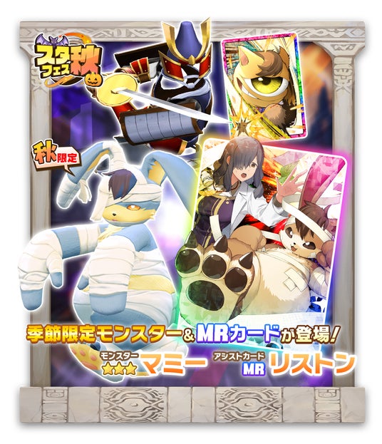 また、「スタフェス(秋)」では新モンスター2種、新アシストカード2種が登場します。新★3モンスターにハム種「マミー」とデュラハン種「ショーグン」の2種、新アシストカードにライフ&命中の「フォース」で登場するMR「リストン&エイル」とSSR「【ガンバ】ガンバーン」の2種が登場します。ほかにも「マスターハート」、「黄のオーラハート」、「黄のプシュケー」、「超ごちそうもどき」などの豪華報酬が得られる育成ランキングイベント「モンスターグランプリ」を開催します。
