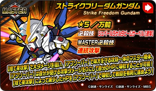リリース3,000日突破を記念して、新コンセプト「マスターMS」が登場します。「マスターMS」は専用のマスター必殺技を所有しています。バトル中に条件を満たせば、マスター必殺技は複数回の発動が可能です。さらに、ユニットの編成条件を満たすと発動時にカットイン演出が入り機体性能がアップします。初登場となる「マスターMS」は「★5/万能 ストライクフリーダムガンダム」で、ガシャイベント「リリース3,000日突破記念!MMSガシャフェスティバル」から入手可能です。