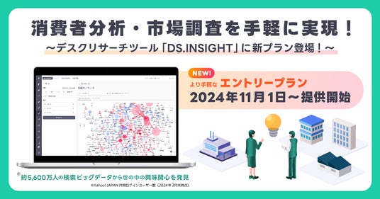 LINEヤフー株式会社(以下、LINEヤフー)が提供する、LINEヤフーの多様なサービスから得られる行動ビッグデータを分析できる事業者向けサービス「ヤフー・データソリューション」は、デスクリサーチツール「DS.INSIGHT」の利用プランにおいて、月額2万円で検索ビッグデータをインサイト分析などに活用できる「エントリープラン」の提供を11月1日(金)より新たに開始します。「エントリープラン」の事前申し込みは本日10月8日(火)より可能です。