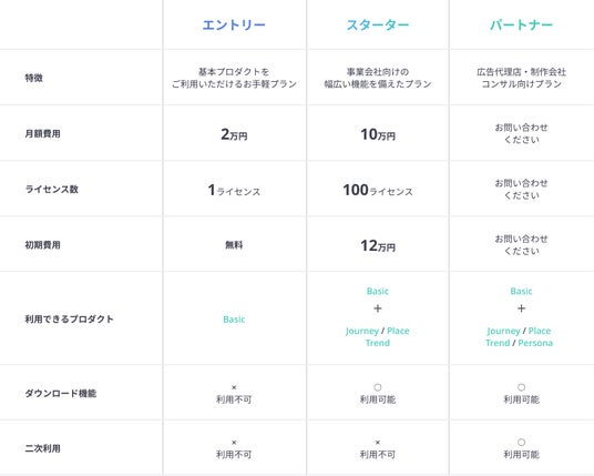 「Journey」及び、従来の位置情報ビッグデータを分析に活用できる「Place」、検索数がこれから上昇しそうなキーワードなどを可視化できる「Trend」は、月額10万円の「スタータープラン」で利用が可能です。なお、ビッグデータからターゲットの詳細な人物像を可視化できる「Persona」は原則オプションサービスとなります。