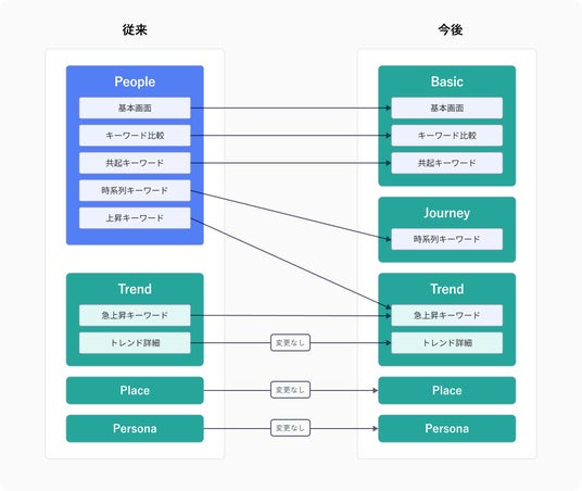 「エントリープラン」の提供に伴い、検索ビッグデータを活用する従来の「People」は、検索キーワードから人々の興味関心を分析できる「Basic」と検索行動を時系列で分析できる「Journey」に生まれ変わりました。「エントリープラン」では「Basic」のみの利用が可能です。なお、試験導入している生成AIによるデータの読み解きサポート機能のうち、「検索意図を調べる」「隠れたニーズを調べる」は「エントリープラン」でも利用できます(※2)。