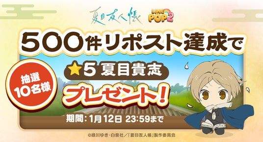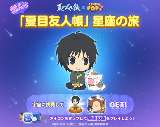 LINEヤフー株式会社は、当社が展開する6角形パズルゲーム「LINE POP2」(iPhone・Android対応/無料)にて、12月27日(金)よりTVアニメ『夏目友人帳』とのコラボレーションイベントを開催します。