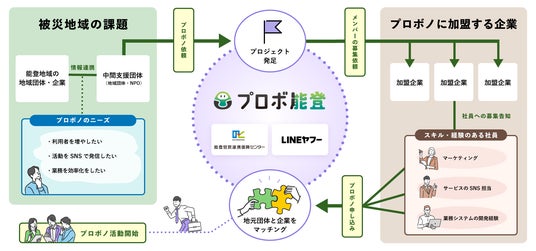 本取り組みでは、LINEヤフーと能登官民連携復興センターが共同事務局を設立し、能登の被災団体のニーズに併せ、プロボノで技術支援を希望する企業をマッチングさせるプラットフォーム「プロボ能登」を実施していきます。