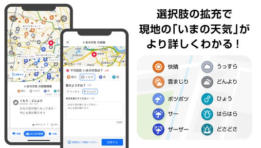 これにより、ユーザーは各種レーダーに加え、同地点にいる他のユーザーの実体験・感覚も参考にすることで、より精度の高い天気の予測と身支度などの行動に役立てられます。また、同じ雨でも「ポツポツ」「ザーザー」等の表現を加えられるため、現地の体感をより直感的に表現・理解できます。