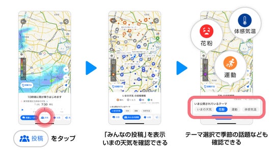 同時に「みんなの投稿」の定期的な利用や投稿を促進していくため、天気と関わりの深い「服装」や「桜の開花状況」なども含め、幅広いテーマを提供していくことで、ユーザーが毎日開いて楽しめる機能を目指していきます。
