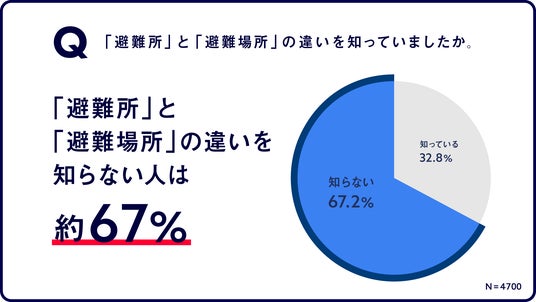 「避難所」は一定期間避難生活をする場所、「避難場所」は災害時に身を守るために一時的に避難する場所、と明確な役割の違いがありますが、約67%の人が「避難所」と「避難場所」の違いを知らないと回答しました。