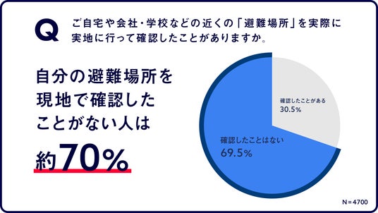 約70%の人が、自宅や会社・学校などの近くの避難場所を実際に現地に行って確認したことがないという結果が明らかになりました。日常的に災害は気にかけているものの、避難に関する具体的な行動にまでは至っていないという実態がわかりました。