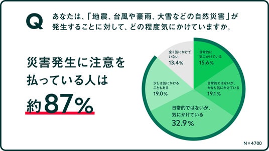 災害発生を気にかけている人は約87%と、多くの人が日頃から災害に対して意識しているということがわかりました。一方で、自宅や会社・学校などの近くの避難場所を正確に把握している人は、約30%しかいないことが明らかになりました。多くの人が災害リスクを認識しつつも、具体的な避難先に関する知識が不足している実態がわかります。