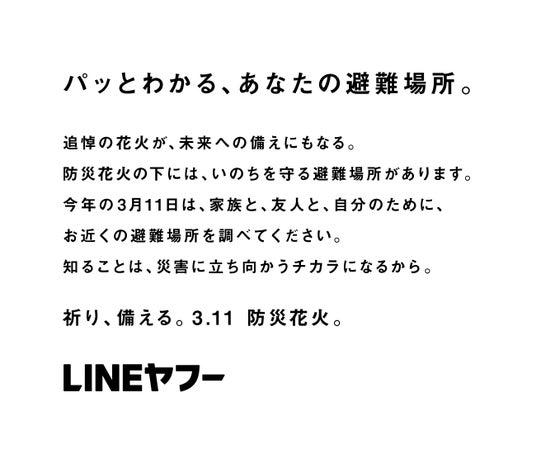 LINEヤフー株式会社(以下、LINEヤフー)は、東日本大震災から14年となる2025年3月11日に「3.11 防災花火」を実施します。「3.11防災花火」は、東日本大震災の被災者追悼とともに、震災を風化させずに未来に向けた防災に繋げていきたいという想いを込め、3月11日19時より明治神宮外苑・東京都立駒場高等学校・川崎市河川敷の3箇所の「避難場所」から花火を打ち上げます。