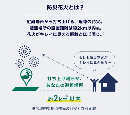 本企画は、「避難場所の設置距離」と「打ち上げ場所から花火が綺麗に見える距離」の目安が同じ約2km以内であることから、自宅周辺から防災花火が綺麗に見えた人は、花火の打ち上げ場所が自分の避難場所の1つであることがわかるという取り組みです。本企画の特設サイトでは、自宅周辺の避難場所を簡単に調べられるほか、避難場所・避難所の違いなどを学ぶことができます。