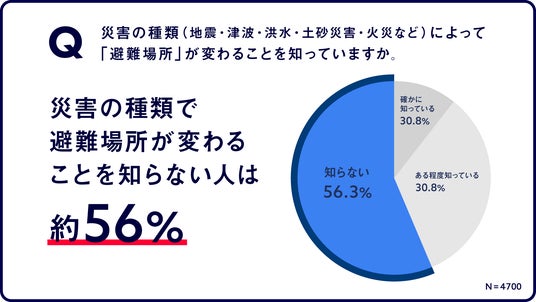 さらに、災害の種類(地震・津波・洪水・土砂災害・火災など)によって避難する「避難場所」が変わることを知っている人は約56%という結果が明らかになりました。