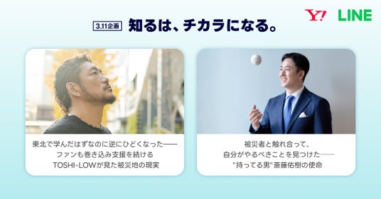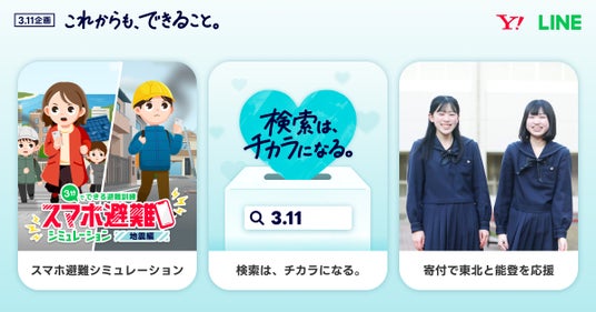 LINEヤフー株式会社(以下、LINEヤフー)は、東日本大震災から14年となる今年の3月11日に向けて、東日本大震災および能登半島地震・豪雨の被災地支援や、震災の風化防止、未来の防災行動につなげる企画「3.11 これからも、できること。」を実施します。
