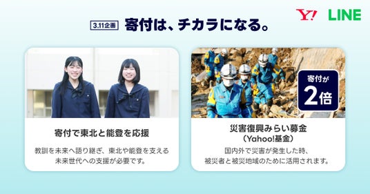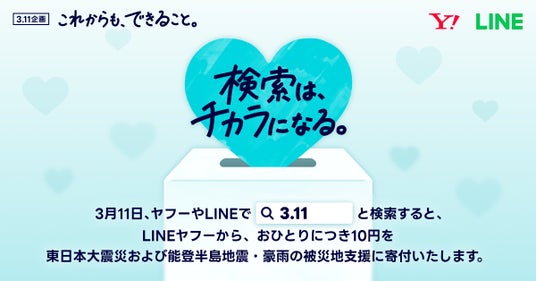 2025年3月11日に「Yahoo!検索」もしくは「LINE」のニュースタブ上部の検索窓で「3.11」と検索すると、ひとりにつき10円を東北支援に取り組む団体や、能登半島地震・豪雨の被災地支援に取り組む団体へLINEヤフーが寄付します※1。