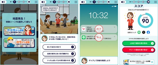 今回は、夫婦が離れた場所にいるときに巨大地震が発生したという設定のもと、夫と妻、2つのストーリーから選べる形にリニューアルしました。夫は自宅の近所で火災が発生している状況、妻は外出先で津波の危険が迫っているなか、「Yahoo! JAPAN」や「LINE」アプリの防災機能を使いながら一連の避難行動をシミュレーションできます。ユーザーは、シミュレーション中に出題されるクイズを通じて場面ごとに適切な行動を学べるほか、終了後も防災知識に関するコンテンツを見ながら振り返りを行えます。どなたでもスマートフォンやタブレット、パソコンから体験が可能です。