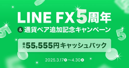 LINE証券株式会社(以下:LINE証券)が提供する店頭外国為替証拠金取引(以下、FX取引)サービス「LINE FX」は、2025年3月16日(日)でサービス提供開始から5周年を迎えました。このたび、LINE FXの5周年と新たに取扱い通貨ペアとラージ銘柄を追加したことを記念して「LINE FX 5周年&通貨ペア追加記念キャッシュバックキャンペーン」を2025年3月17日(月)より開催します。また、ユーザーからのご要望に応えるために、2025年度中の「LINE CFD」サービス提供を目指しています。