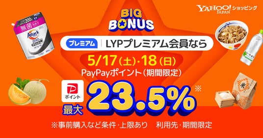 LINEヤフー株式会社(以下、LINEヤフー)が運営する毎日おトクな「Yahoo!ショッピング」は、2025年5月1日(木)正午から18日(日)まで「ヤフービッグボーナス」を開催します。5月の「ヤフービッグボーナス」は、「生活応援」をテーマに掲げ、物価高の中でユーザーを応援します。5月17日(土)と18日(日)の最終2日間(+2時間)は、事前のお買い物など条件を満たすとLYPプレミアム会員なら、最大23.5%の「PayPayポイント(期間限定)」が戻ってきます。さらに、肉や魚、スイーツなどの食品や、サプリメント、タオルといった日用品などが対象の「2日間セール」も同時開催されます。