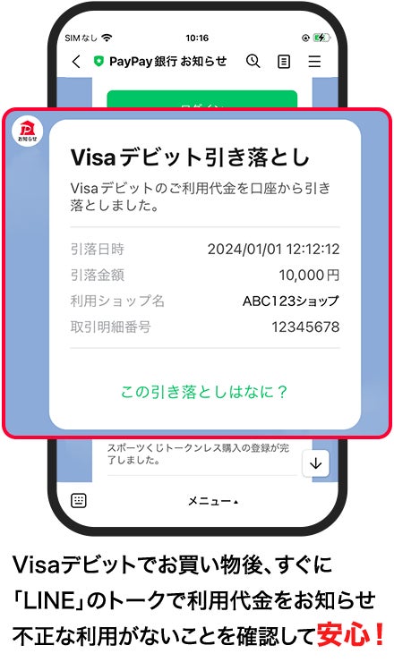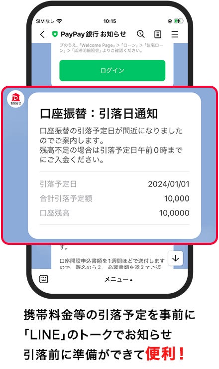 本サービスは、PayPay銀行のアプリを立ち上げることなく、24時間365日、いつでも好きなタイミングで「LINE」から、振り込みや、残高確認などの銀行サービスを利用できます。また、PayPay銀行のLINE公式アカウントから、金利・給料などの入金情報、振込時や携帯代金といった引落予定の通知をリアルタイムで受け取れるほか、日々利用する「LINE」からお金の流れが把握できるため、安心して利用できます。