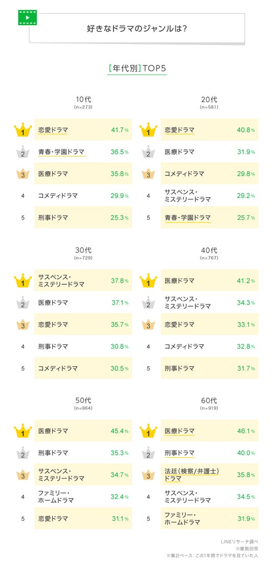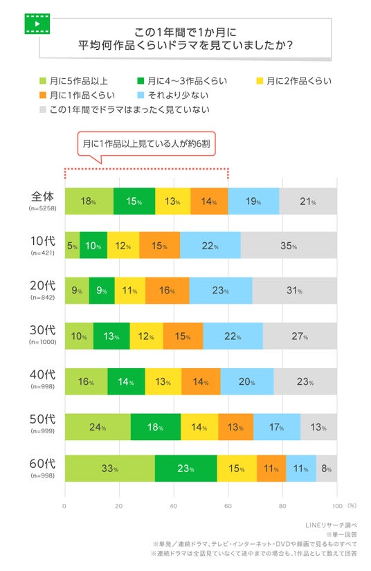 LINEリサーチ、全国の10~60代の男女を対象に、1年間でドラマをどのくらい見ていたかと好きなドラマのジャンルに関する調査を実施