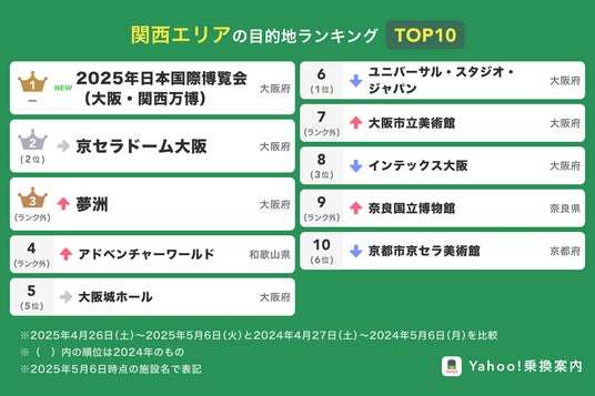 【Yahoo!乗換案内】2025年GWに最も検索された目的地ランキングを発表。全国7エリアのうち関西エリアの1位は「大阪・関西万博」