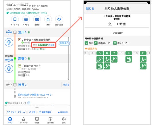 また、検索結果で表示される乗車位置の“詳細”をタップすると、車両番号や、その車両付近にエレベーターなどの設備があるのかをアイコンで簡単に確認できます。