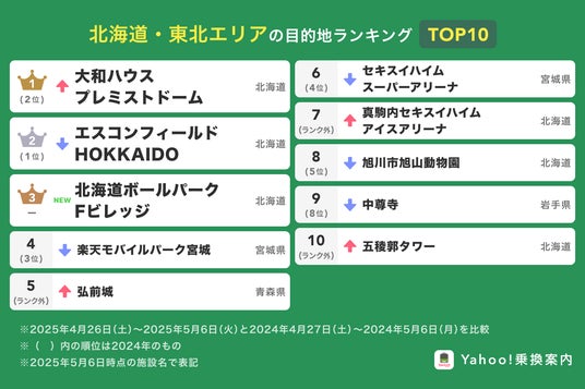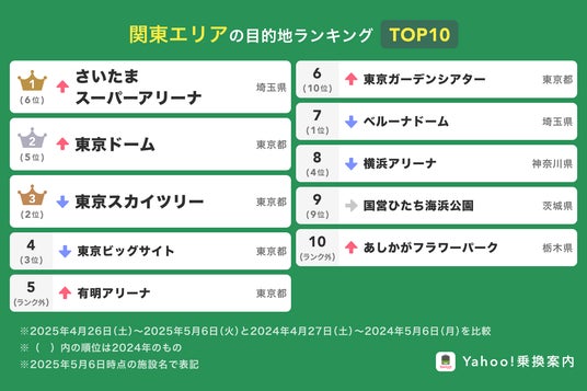 LINEヤフー株式会社(以下、LINEヤフー)が提供する乗換検索アプリ「Yahoo!乗換案内」(iOS版、Android版)は、「Yahoo!乗換案内」の検索データをもとに、2025年のゴールデンウィーク(以下、GW)に検索された目的地のランキングを発表しました。