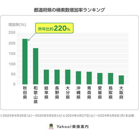 「Yahoo!乗換案内」の到着地に駅や施設を指定した検索の伸び率を、都道府県ごとに昨年と今年のGW(※2)で比較しました。昨年と比べて、検索の増加率が伸長した都道府県の1位は「秋田県」、2位「和歌山県」、3位「岐阜県」という結果になりました。