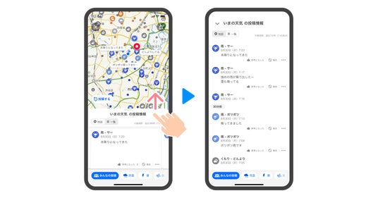 さらにこのたび、「みんなの天気」で好評だった時系列表示を、「みんなの投稿」でも確認できるようになりました。雨雲レーダーから「みんなの投稿」モードに切り替え、下部シートを引き上げると、最大で過去7日間の投稿をさかのぼって確認できます。シートを引き下げれば、時系列表示と地図画面を簡単に行き来できます。
