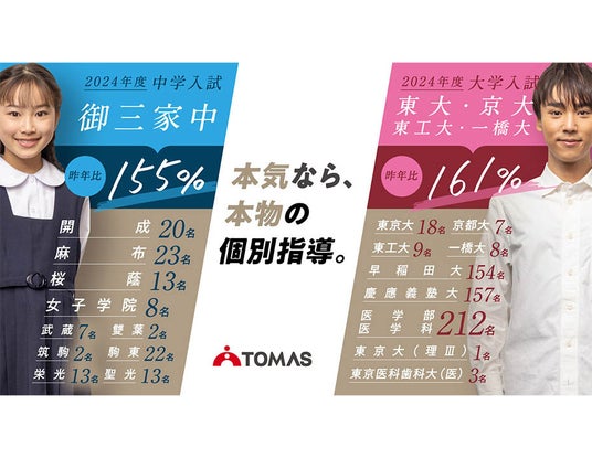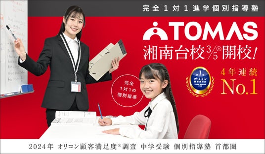 進学個別指導塾「TOMAS」が2024年 オリコン顧客満足度(R)調査 中学受験 個別指導塾 首都圏ランキング(以下「本ランキング」)において全8つの項目※で評価された結果、総合1位を獲得いたしました。本ランキングにおいて総合1位を獲得するのは2021年以降4年連続となります。引き続き皆様に満足していただける“本物の教育サービス”を提供できるよう全力で努めてまいります。※「成績向上・結果」「適切な受講費用」「講師」「カリキュラムの充実さ」「教室・自習室」「通いやすさ・治安」「スタッフ」「情報提供」の8項目
