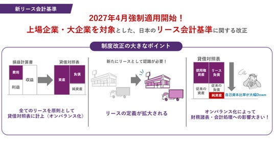 また、新リース会計基準では、レンタル契約や不動産賃貸契約など、従来リースとして認識していなかったものを新たにリースとして管理することになります。2027年4月の強制適用に向けて、対象企業は複雑化するリース会計処理への対応準備に迫られています。