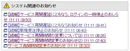 サービス再開時間変更のお知らせ (11.11 05:30)